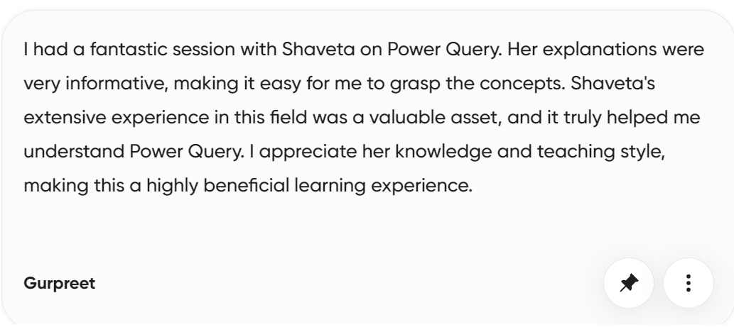 Shaveta Khullar is an outstanding Excel instructor. Her ability to break down complex Excel functions into digestible concepts is truly commendable. The personalized attention she gives to each student ensures a thorough understanding of the material. I am grateful for Shaveta's expertise, which has significantly improved my Excel proficiency —Saurav Chouhan